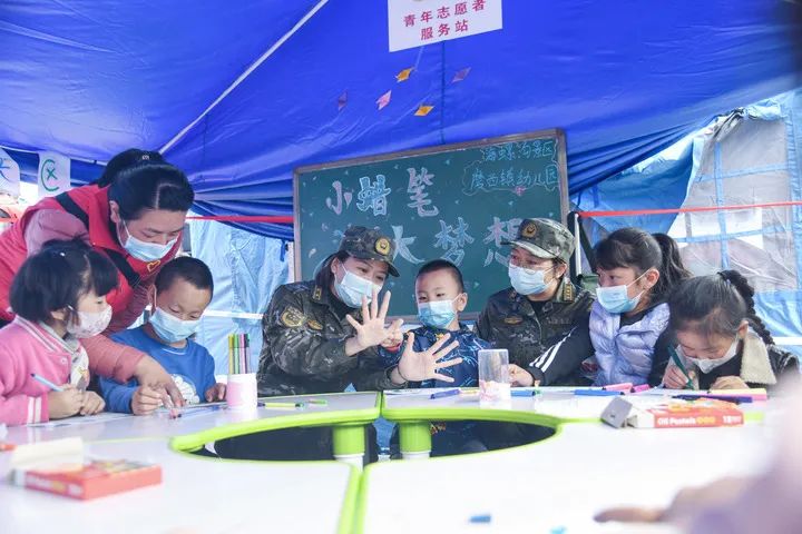 在泸定县磨西镇贡嘎广场上的集中安置点的“青青儿童乐园”里,三年级学生陈雅熙正在志愿者和老师们的陪伴下画画。截至8日上午,磨西镇已经分别在4个安置点设立了“青青儿童乐园”,在这个特殊时期安抚和陪伴孩子们。