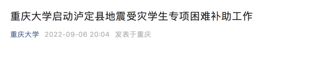 地震发生后,包括武汉大学、中南民族大学、重庆大学等在内的全国多所高校发布通知:对四川泸定地震受灾家庭经济困难学生开展专项资助。