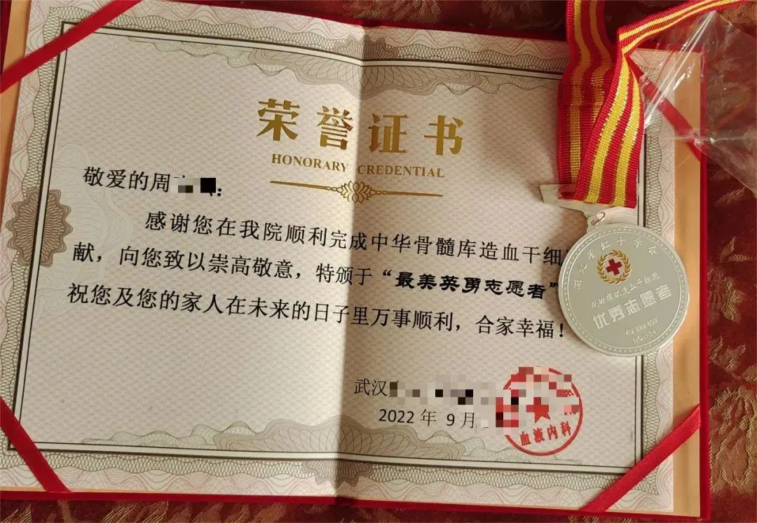 医院给周先生颁发的荣誉证书