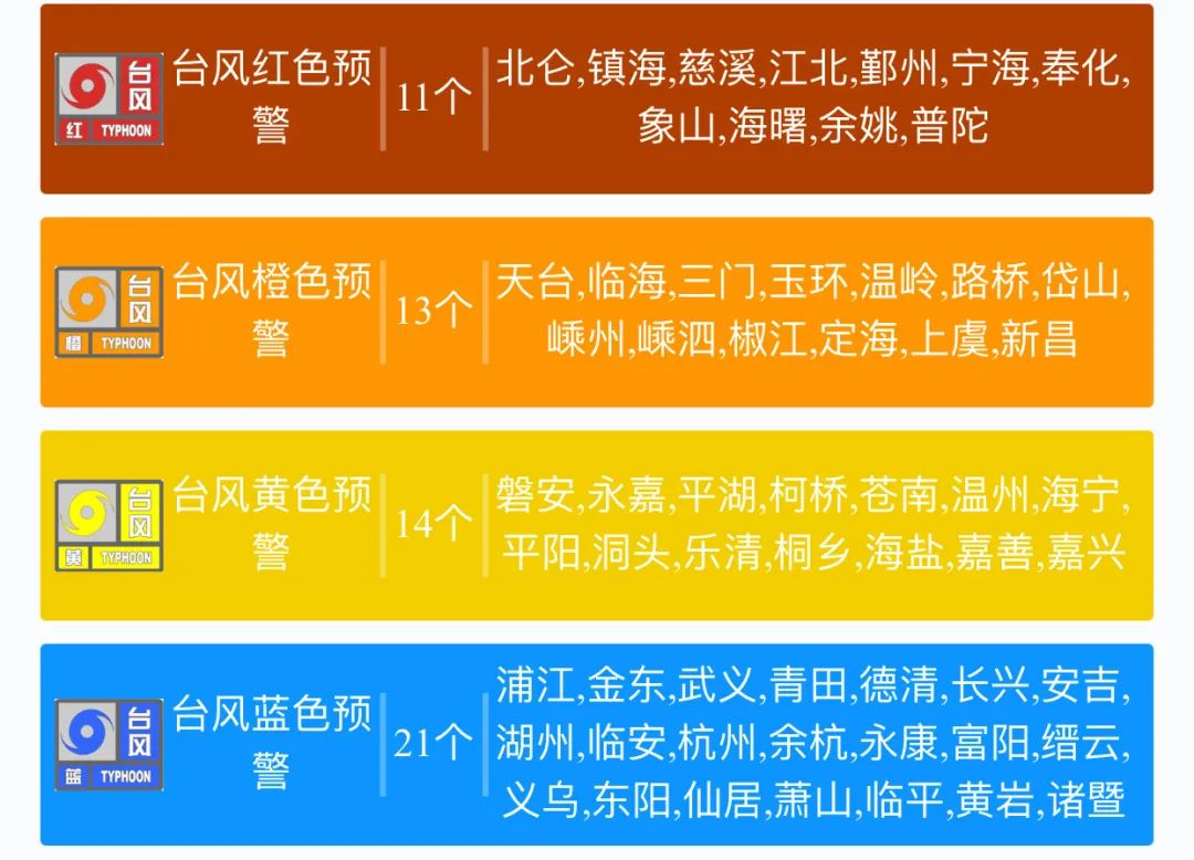据浙江天气9月14日早间消息,浙江全省目前发布状态下的气象灾害预警信号中台风预警59条,其中有11个区县已经发布了台风红色预警。