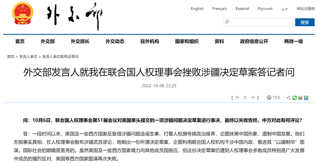 10月6日深夜,外交部网站发布消息,外交部发言人就中国在联合国人权理事会挫败涉疆决定草案答记者问。
