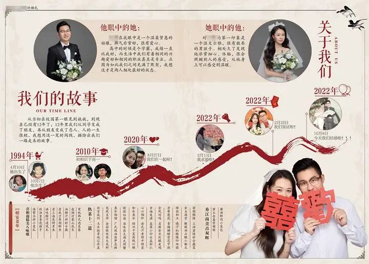 婚宴现场,除了能看到这样有创意的礼金互免卡,每张桌上还有小陈设计的两人海报,内页是以时间轴为主线记录的两人相识相恋的美好过程,以及从小到大的照片,还有当天婚宴的菜单。