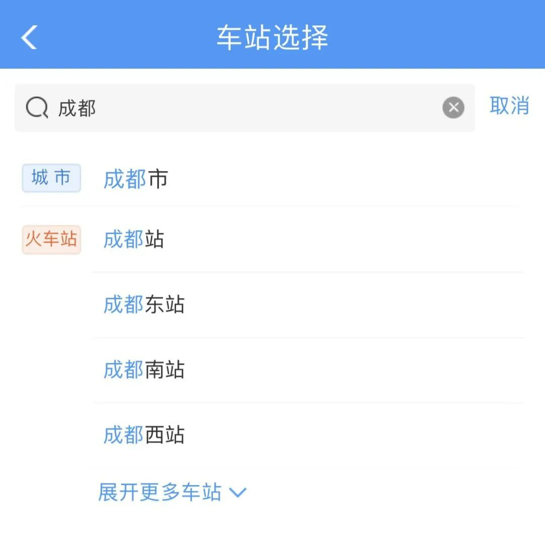 打开12306APP可以看到,在首页填写目的地时,系统就会生成一个车站列表。比如输入成都,页面就会用蓝色标明“成都市”,下方则用红色标明成都市内的所有火车站,点击选择要去的车站即可。