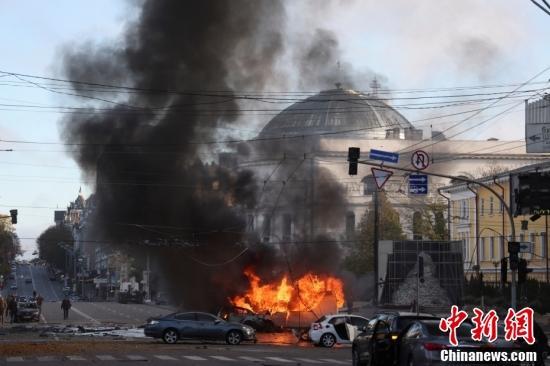 资料图:当地时间2022年10月10日,乌克兰首都基辅市中心发生多次爆炸。图为基辅市中心爆炸导致汽车燃烧。