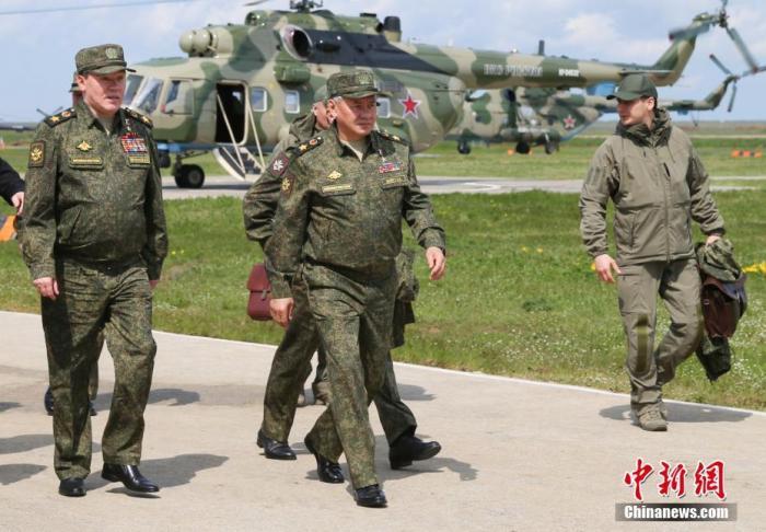 资料图:2021年4月22日,俄罗斯国防部发布消息称,俄军在克里米亚地区举行大型跨军种演习。期间,俄罗斯国防部长绍伊古(左二)前往演习现场视察。中新社发 俄罗斯国防部供图