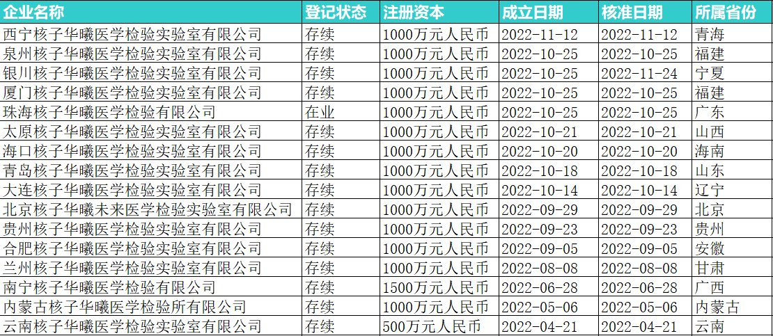 数据统计显示,截至发稿时,核子基因仅在2022年就注册了16家“核子华曦”,注册时间大多集中在近3个月。其中,11月份注册了西宁公司;10月份批量注册了珠海、泉州、厦门、银川、太原、青岛、大连、海口8家公司;9月注册了北京核子华曦未来医学检验实验室有限公司和贵州公司,8月份注册了兰州公司;5月份注册了内蒙公司。核子基因还通过其100%控股的合肥、南宁、云南的核子基因科技有限公司注册核子华曦的合肥公司、南宁公司和云南公司。