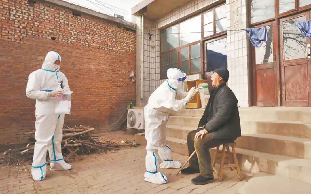 ▲此前,石家庄市使庄村,医务人员入户为行动不便村民核酸采样。图/新华社