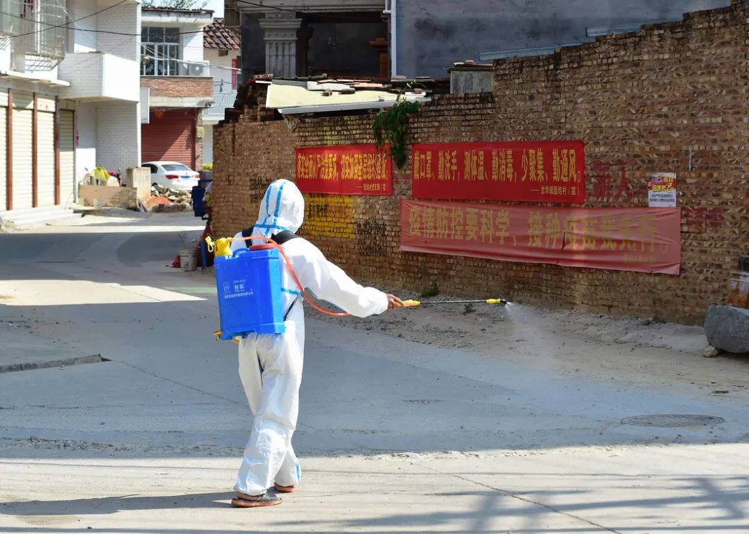 ▲此前,在福建省莆田市仙游县龙华镇团结村,一名社区志愿者在对村道进行消杀。图/新华社
