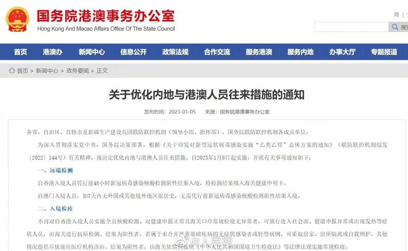 5日,国务院联防联控机制综合组发布《关于优化内地与港澳人员往来措施的通知》,自1月8日起实施。