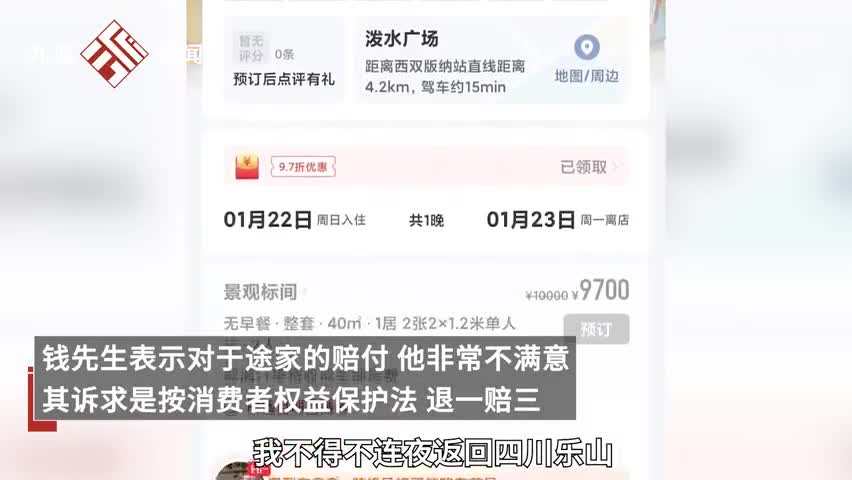 1月20日,云南西双版纳。网友爆料称其于2022年12月在途家APP预定春节期间酒店,当日前往酒店办理入住时被商家以房价涨价为由拒绝其入住。当事人钱先生表示,他一共预定5天,支付金额1160元,被拒绝入住后因同类型房价暴涨5至10倍,他只能连夜返回老家。事后途家提出补偿400元,外加首晚住宿费30%的费用69元,共469元。钱先生表示对于途家的赔付,他非常不满意,其诉求是按消费者权益保护法,退一赔三。