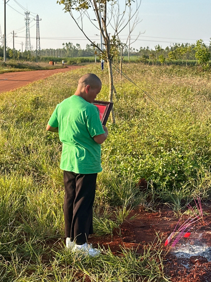 李海玉带着父亲遗像重返当年弟弟的埋尸处祭拜