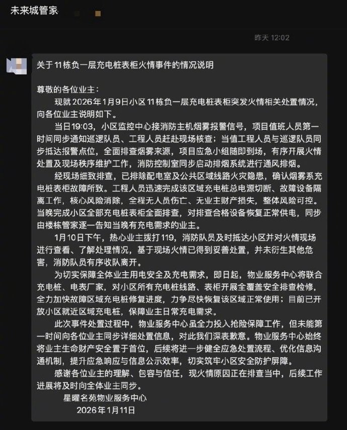成都一小区地下室充电桩表柜发生火情,物业未及时报警引业主质疑,房产服务中心:初步确定为线路故障引起的火灾