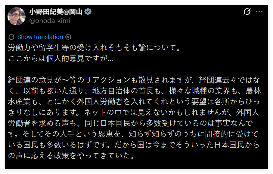 此前,为了迎合日本右翼民粹势力这个重要的“基本盘”,高市政府曾多次扬言要限制在日外国人的权利,推广“日本人优先”的政策,但小野田纪美却在她的帖文中表示,日本要想生存和发展,眼下还离不开外国人。