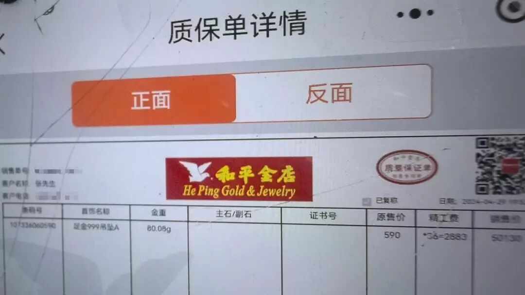 张先生提供的金吊坠质保单显示,他于2024年4月以5万余元的价格购入这块金吊坠,他说购买后自己一直贴身携带。