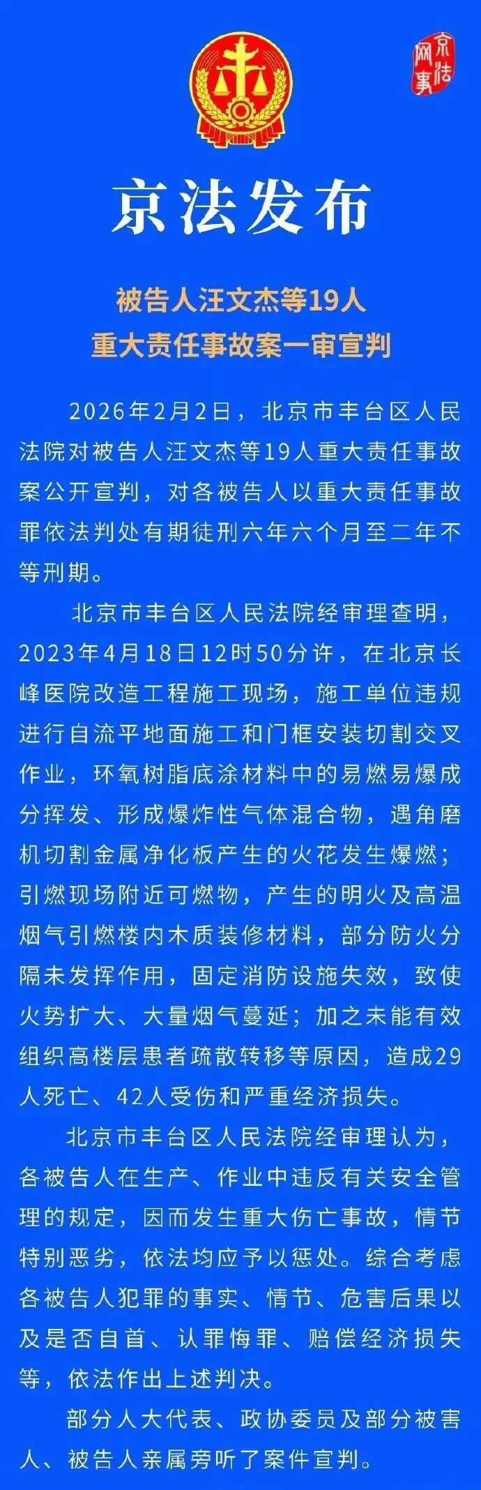 2026年2月2日,北京市丰台区人民法院对被告人汪文杰等19人重大责任事故案公开宣判,对各被告人以重大责任事故罪依法判处有期徒刑六年六个月至二年不等刑期。