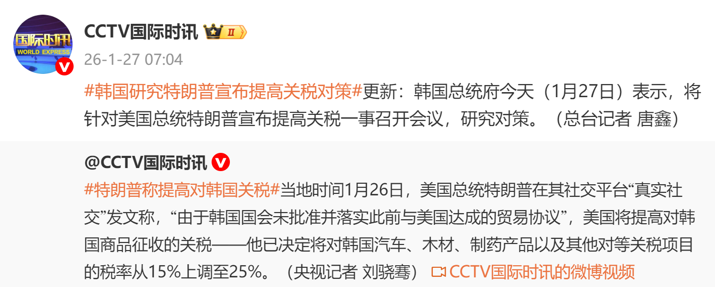 此前据新闻,当地时间1月26日,美国总统特朗普在其社交平台“真实社交”发文表示,由于韩国国会未批准并落实此前与美国达成的贸易协议,美方将提高对韩国商品征收的关税税率。
