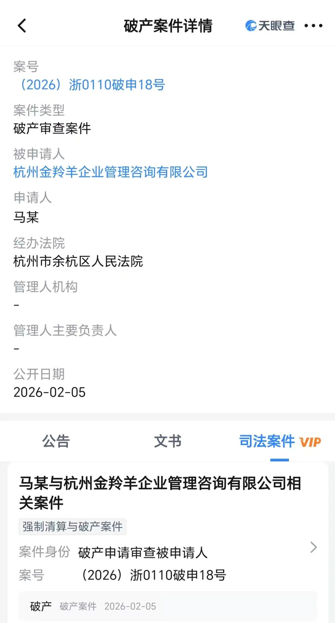2月6日,记者从天眼查APP获悉,近日,自嗨锅关联公司杭州金羚羊企业管理咨询有限公司(下称杭州金羚羊)新增一则破产审查案件,申请人为马某,经办法院为杭州市余杭区人民法院。