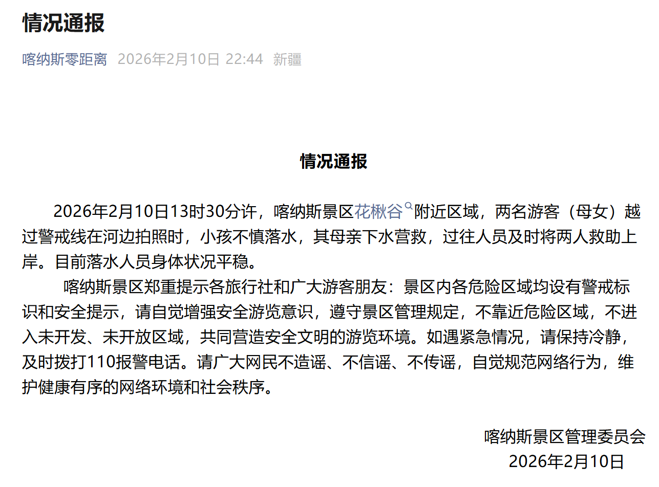 10日晚,新疆喀纳斯景区管理委员会发布情况通报:2026年2月10日13时30分许,喀纳斯景区花楸谷附近区域,两名游客(母女)越过警戒线在河边拍照时,小孩不慎落水,其母亲下水营救,过往人员及时将两人救助上岸。目前落水人员身体状况平稳。
