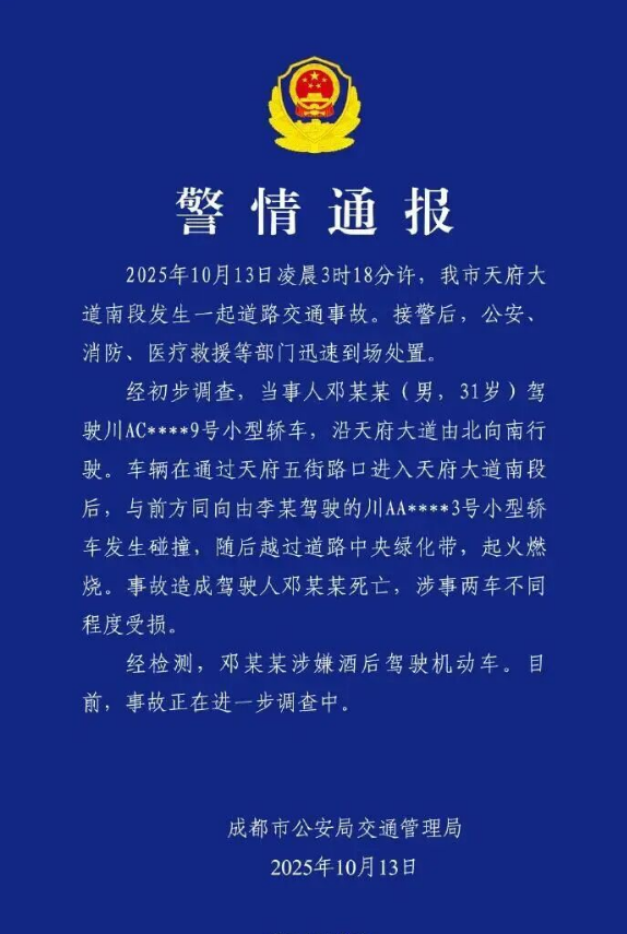 2025年10月13日,成都公安发布的警情通报显示,当日凌晨3时许,成都天府大道南段发生一起道路交通事故,当事人邓某某(男,31岁)驾驶小型轿车,行驶过程中与前方同向由李某驾驶的小型轿车发生碰撞,随后越过道路中央绿化带,起火燃烧;事故造成邓某某死亡,经检测,其涉嫌酒后驾驶。