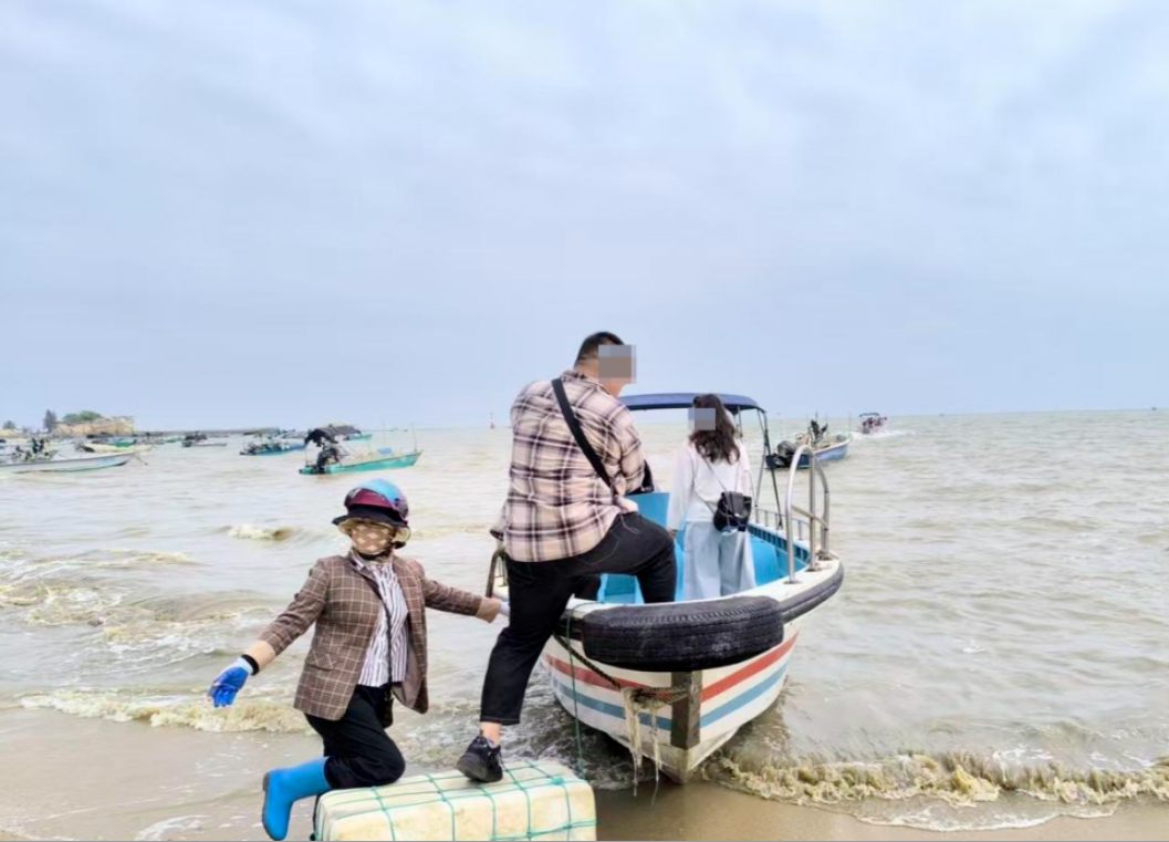 “出海观豚”联动着景区里的“吃、住、行”。在沙滩上散步,在景区里的民宿入住,到景区里的小卖部购物,正在整理渔具的渔民、民宿老板、小卖部收银员都有可能试探性地递来一句:“出海看海豚吗?”一些大排档的招牌上,写着“代办看海豚”,是私人船带游客出海前“候船区”。有的船长也会向游客推荐合作的酒店和民宿。