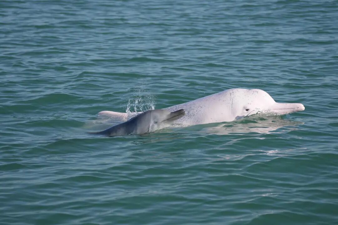 中华白海豚,国家一级保护动物,被称为“海上大熊猫”。幼年白海豚全身深灰,老年个体的皮肤呈白色,在剧烈运动时因血液充盈,皮肤泛出淡粉色,被视为吉祥好运的象征。