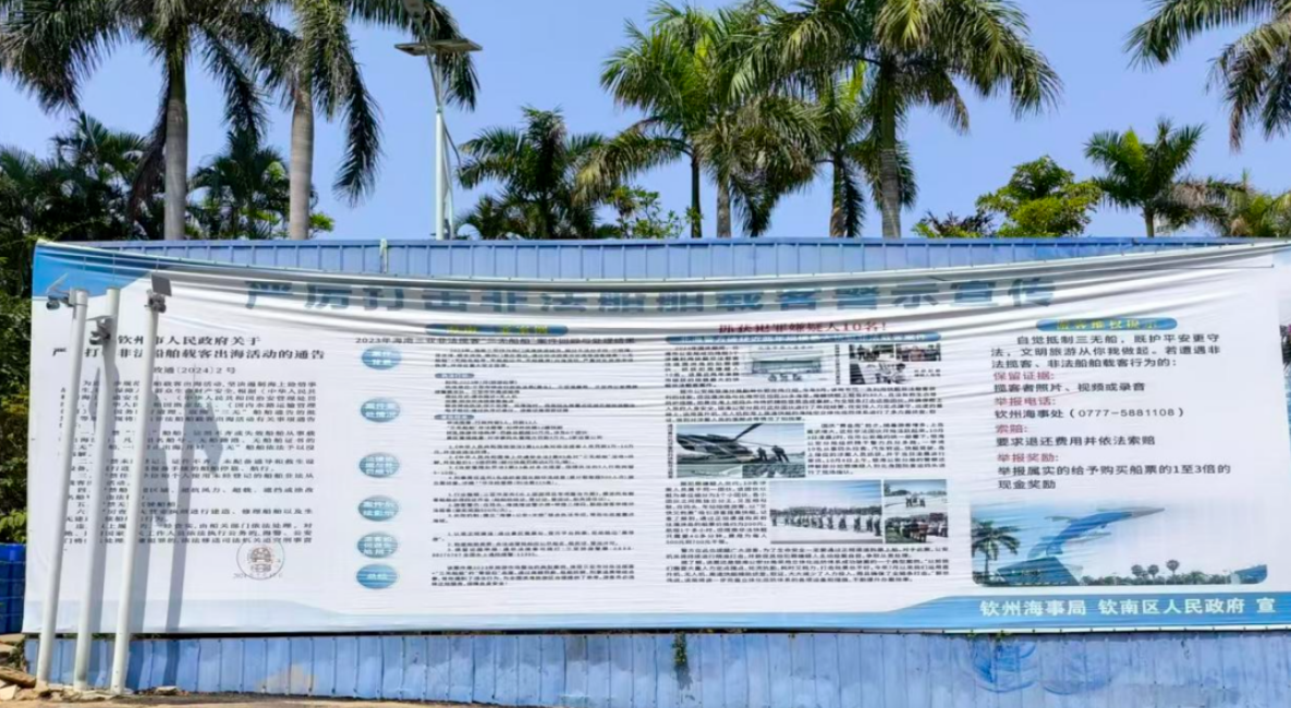 没有船名船号,也没有船舶证书的船只属于“三无船舶”,载客出海是违法行为。针对“三无船只”揽客,相关部门曾多次开展整治行动。据广西海事微信公众号,2024年5月以来,钦州海事局与钦南区人民政府共同牵头组织开展三娘湾水域非法船舶载客出海综合治理行动,查获6艘涉嫌非法载客船舶并立案调查,完成6艘“三无”船舶联合认定,促成1艘“三无”船舶自行拆解,依法行政拘留1名违法人员,打击水上非法载客行为。